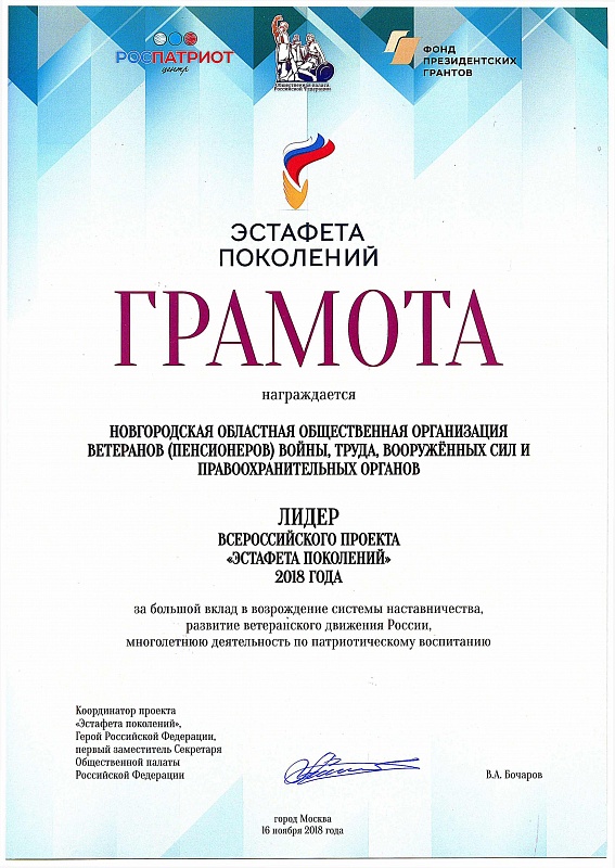 В рамках итогового семинара состоялись пленарное заседание с участием экспертов федерального уровня и круглые столы с целью обмена уникальным опытом реализации проекта региональными отделениями общественных ветеранских организацией, состоялась церемония чествования лучших ветеранов-наставников и наиболее активных ветеранских организаций регионов России. Также, в рамках семинара, прошло награждение победителей II ежегодного конкурса на создание лучших мотивационных постеров и видеороликов «Герои, живущие рядом». Новгородская областная общественная организация ветеранов (пенсионеров) войны, труда, Вооруженных Сил и правоохранительных органов награждена Почетной грамотой Лидера Всероссийского проекта "Эстафета поколений"за большой вклад в возрождение системы наставничества, развитие ветеранского движения России, многолетнюю деятельность по патриотическому воспитанию.
