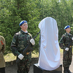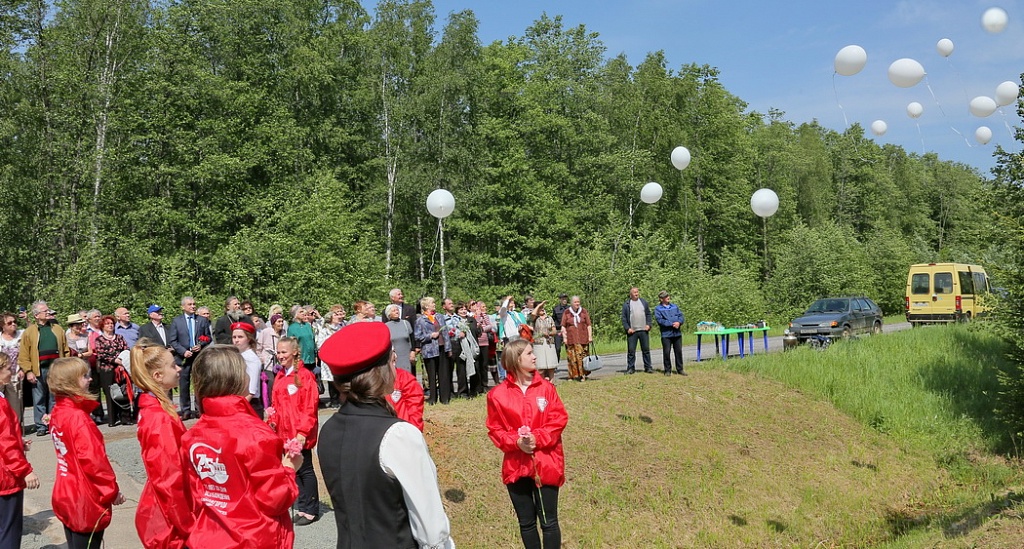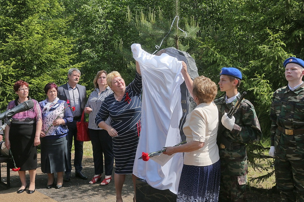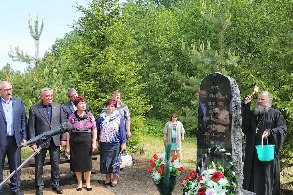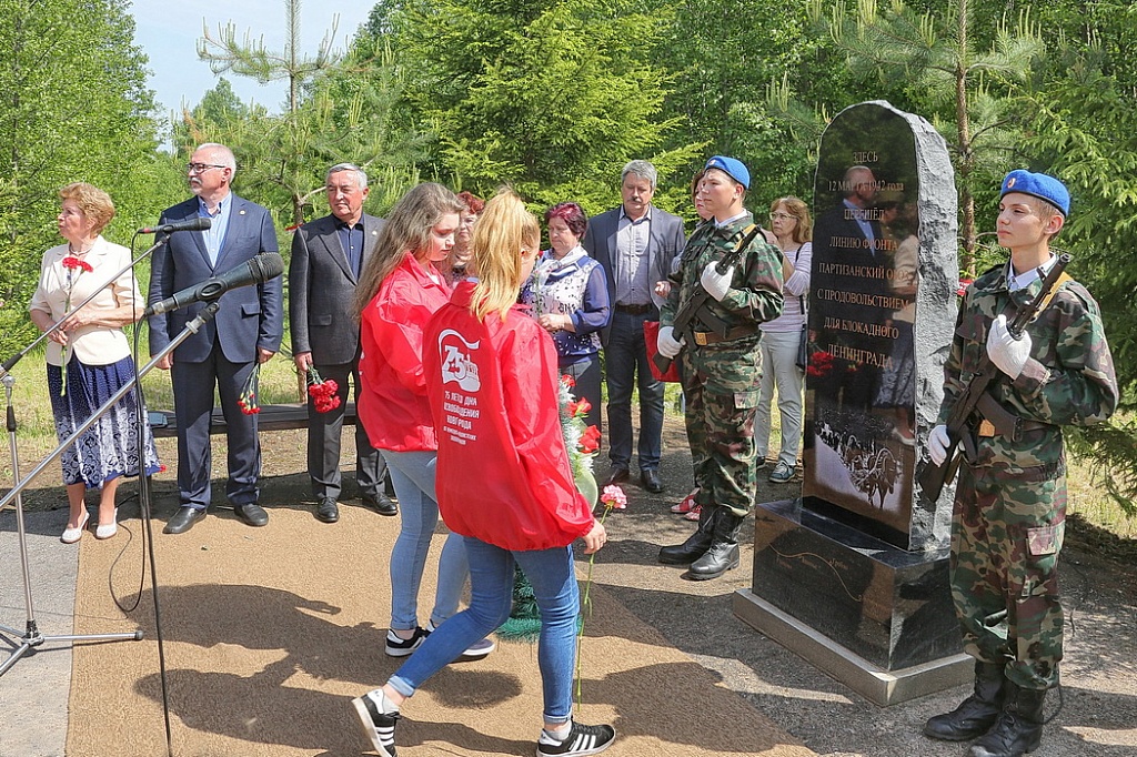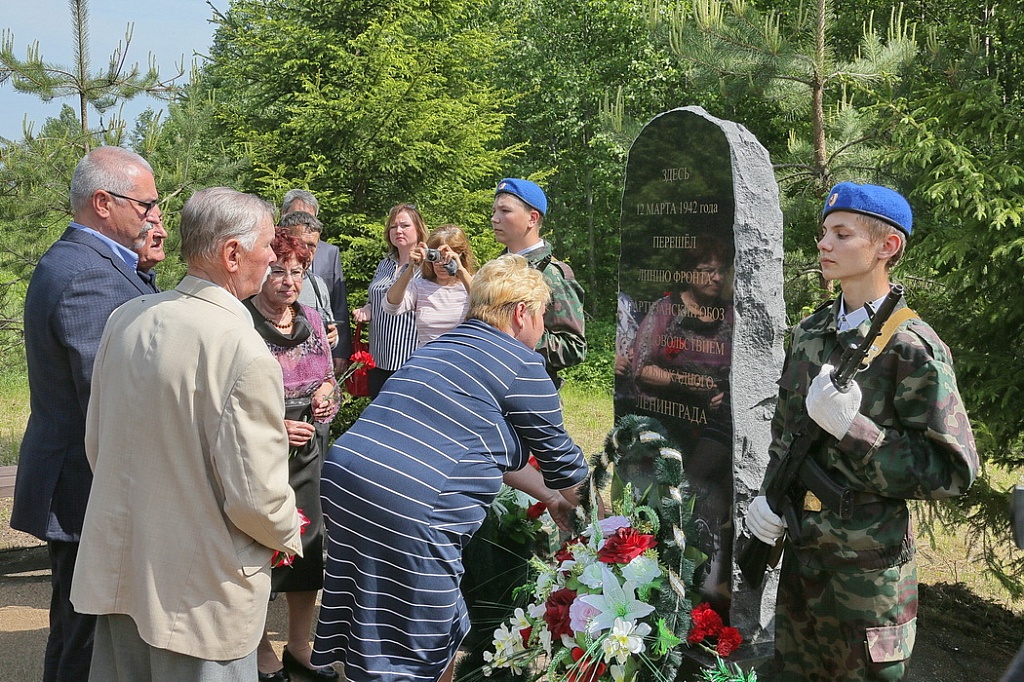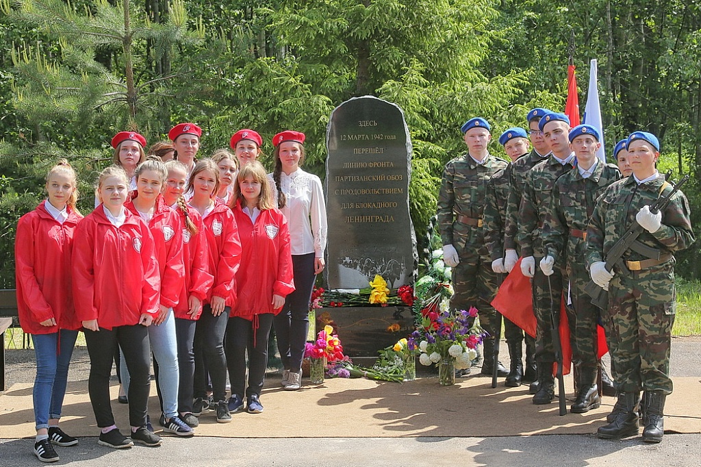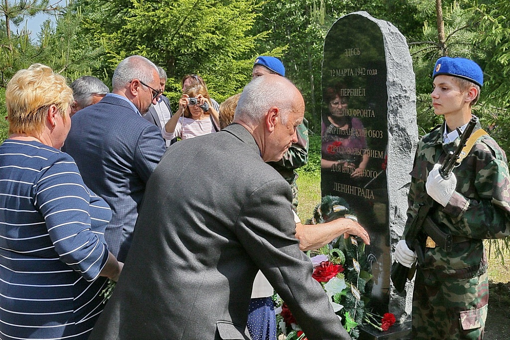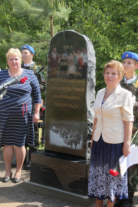 Почетное право открытия было предоставлено Н.И. Пилявской и Е.В. Паниной. На черном граните надпись: «Здесь 12 марта 1942 года прошел линию фронта партизанский обоз с продовольствием для блокадного Ленинграда» с фотографией и маршрутом обоза. Изготовила памятный знак Военно-мемориальная компания Новгородской области. К памятному знаку после минуты молчания присутствующие возложили венки и цветы, многие сфотографировались рядом со знаком. А вечером над памятным знаком пронеслась буря с грозой, ливнем и молниями, омыв его весенним дождем.