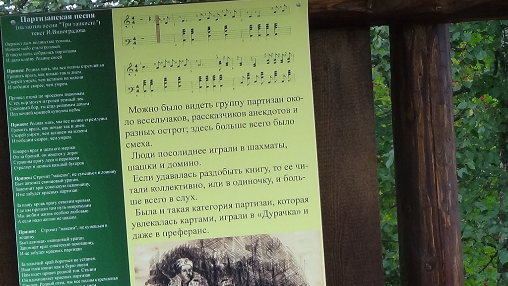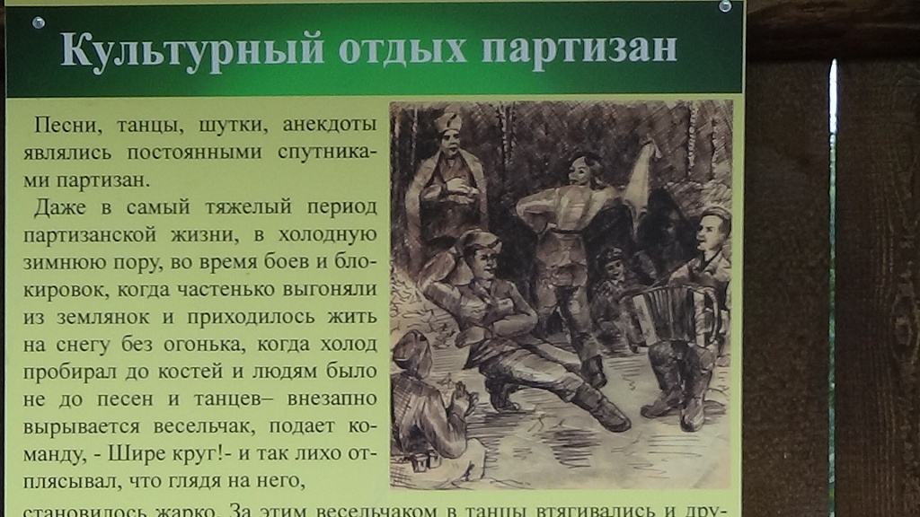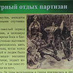 До сегодняшнего дня экспозиция музея была представлена двумя землянками, шалашами и заслонами из природного материала. Музейный комплекс дополняли стрельбище и оборудованное кострище. Сейчас реконструированы эти площадки и добавлены новые. На территории музея появились аллея славы, интерактивная площадка «Школа партизан», которая включает в себя смотровую вышку, окоп и макет рельсовой дороги, огневую позицию, две землянки, амбар, пекарню, мастерскую, кострище.