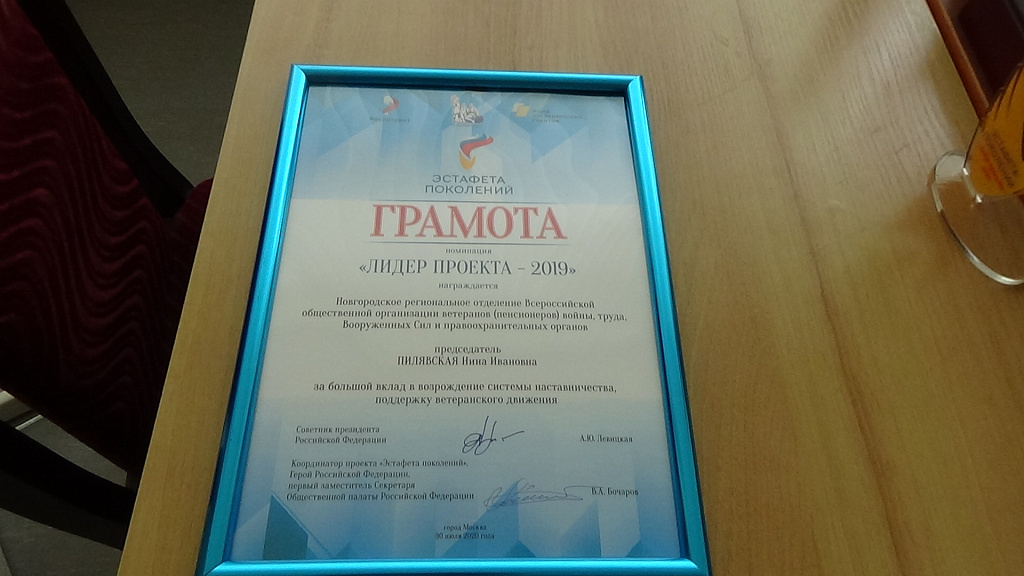 Новгородская областная общественная организация ветеранов (пенсионеров) войны, труда, Вооруженных Сил и правоохранительных органов за большой вклад в возрождение системы наставничества и поддержку ветеранского движения была награждена грамотой в номинации «ЛИДЕР ПРОЕКТА - 2019» .