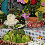 А были и такие участники, которые не любят сами и другим не рекомендуют издеваться над овощами. А зачем? Ведь они и так прекрасны! Посмотрите на эту помидорную ветвь или рябиновую морковную россыпь! А яркая зелень колючих корнишонов или рубиновый глянец 300-граммовых помидор. Зачем же их резать, чем-то украшать? Вот перчик в 302 грамма, картошечка в 219 граммов, помидорчик 308… И всё это богатство так и просится в кошёлку покупателя. Тем более что каждый овощ сопровожден табличкой с точными сведениями о размерах посевного клина и реальном урожае этого года.