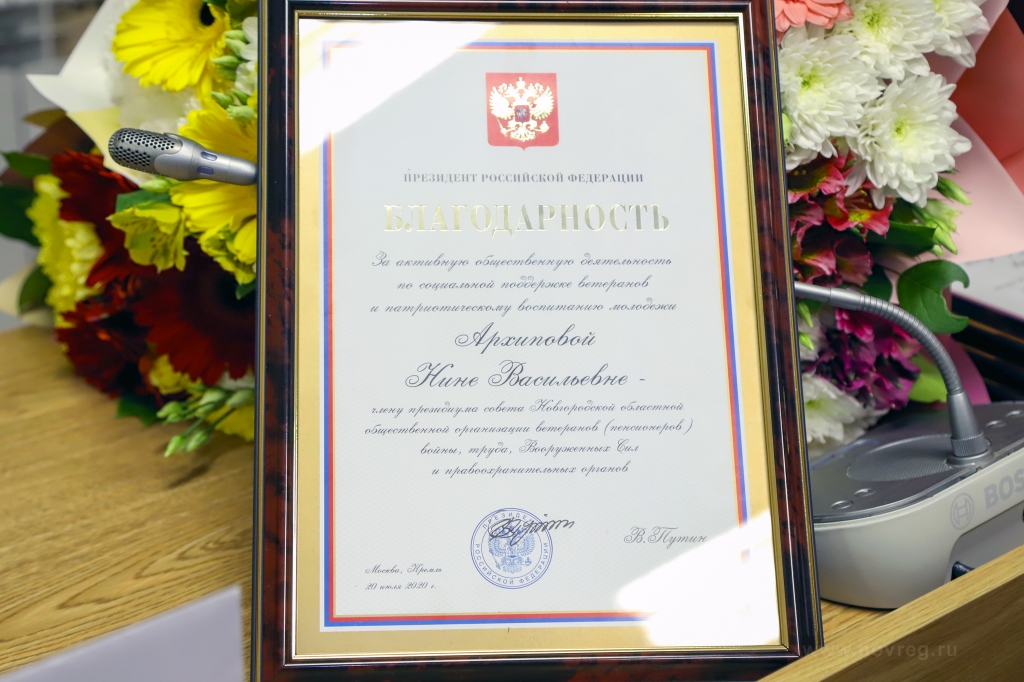 За активную общественную деятельность по социальной поддержке ветеранов и патриотическому воспитанию молодежи Благодарность Президента Российской Федерации на конференции была вручена членам президиума Новгородского Совета ветеранов Нине Архиповой и Тамаре Петровой, председателю совета Старорусской районной организации Юрию Будылеву, председателю совета Холмской районной организации Валентине Павловой и председателю совета Чудовской районной организации Валентине Радевкиной, сообщил пресс-центр администрации области.