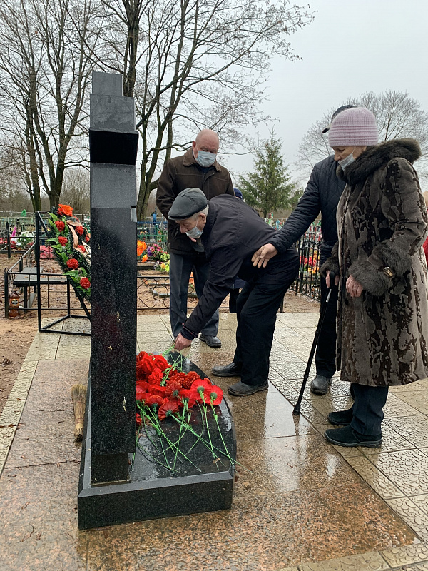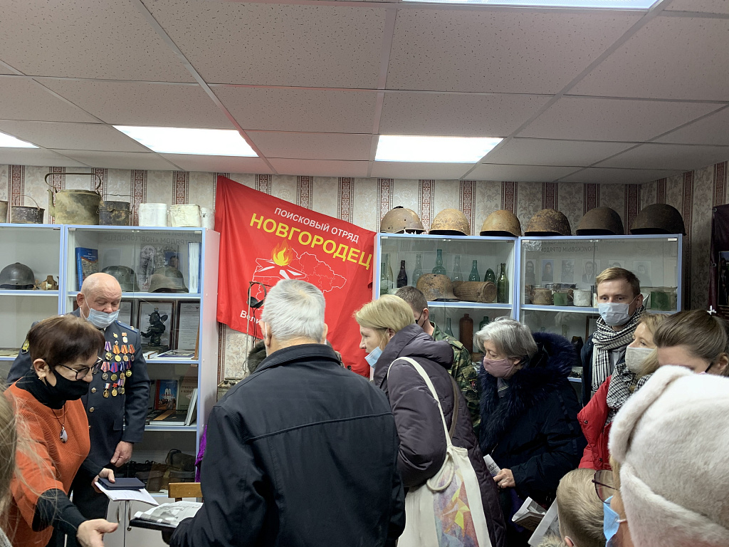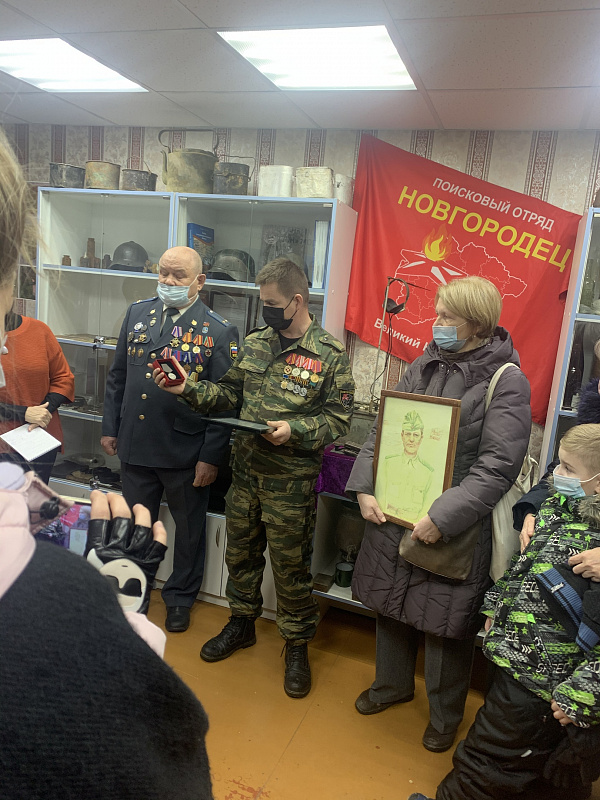 На снимках: 1. Дети солдата Костина В.П. возлагают цветы на братском захоронении в с. Подгощи Шимского района. 2. Фрагменты передачи медали «За боевые заслуги» в музее «Боевой славы» с. Подгощи 19 декабря 2020 года.