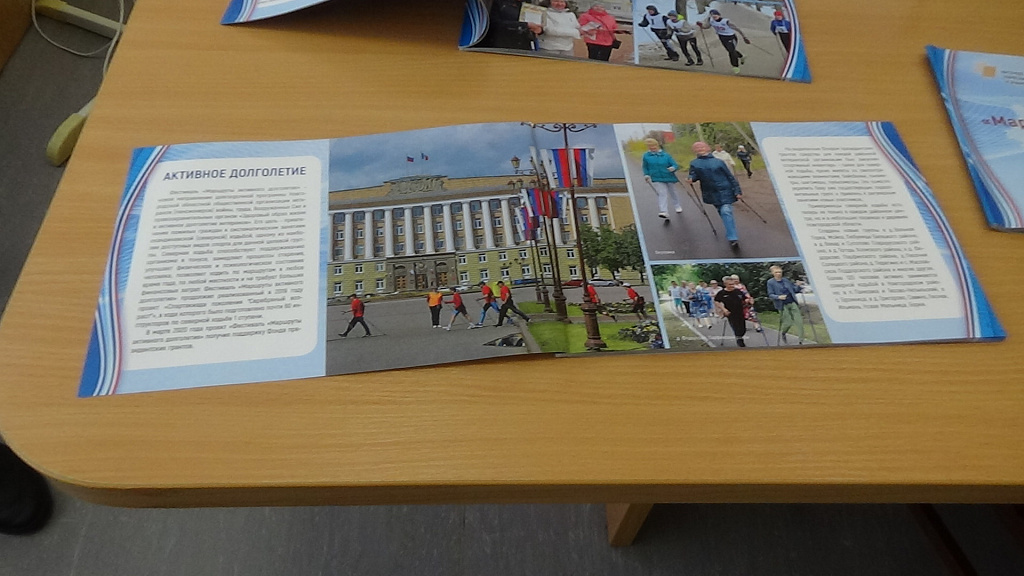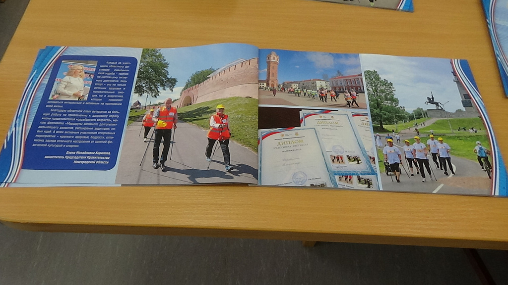 По итогам проекта «Фестиваль “Маршруты активного долголетия”», поддержанного Фондом президентских грантов, областной совет ветеранов выпустил небольшой фотоальбом. В нём нашли отражение все этапы проекта, направленного на привлечения граждан Новгородской области старшего поколения к систематическим занятиям скандинавской (северной) ходьбой, одним из наиболее доступных видов спорта для данной целевой группы. Это – создание новых и укрепление материальной базы уже существующих оздоровительных групп, проведении районных, трех зональных и областного финального фестивалей северной ходьбы, посещение музеев и выставок. В фотоальбоме помещены фотографии представителей всех районных ветеранских команд, с благодарностью названы имена районных руководителей спорта, тренеров и волонтеров-инструкторов, чья деятельность способствовала успешному осуществлению проекта.